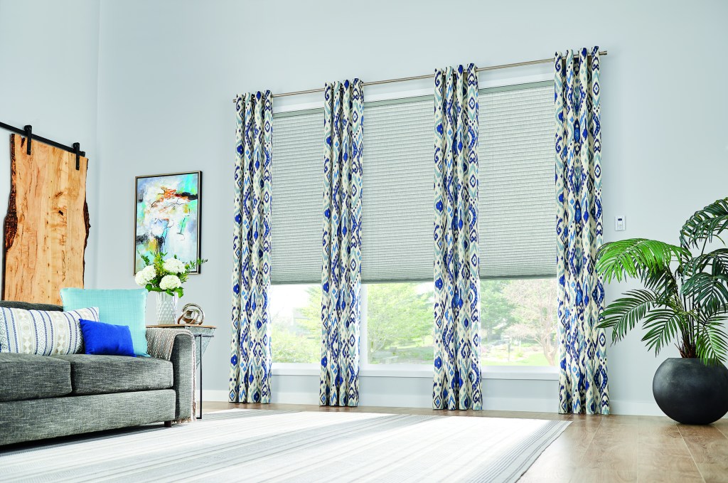 Window-Blinds,Shutters, Shades Windows: 3/4″ Single Cell Cellular Shades with Motorized Lift: Couture, Noble Pewter 0133 Drapery: Decorative Panels with Grommet Top: Kearney, Lakeshore 5760 Hardware: 1″ Finesse Pole in Brushed Nickel, 442 Share this: Share on X (Opens in new window) X Share on Facebook (Opens in new window) Facebook Like Loading...